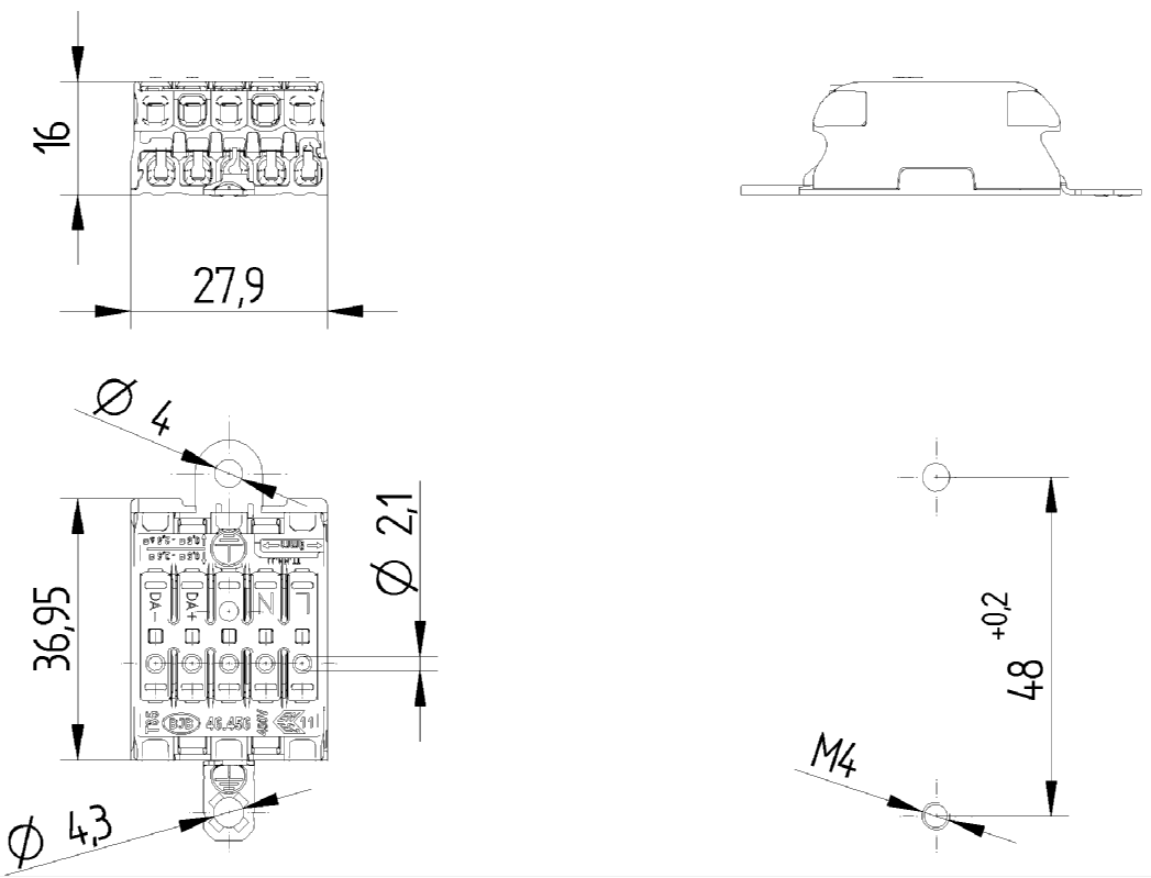 | Ausführung: | Beschriftung L N ⏚ DA+ DA- und Erdungszeichen |
