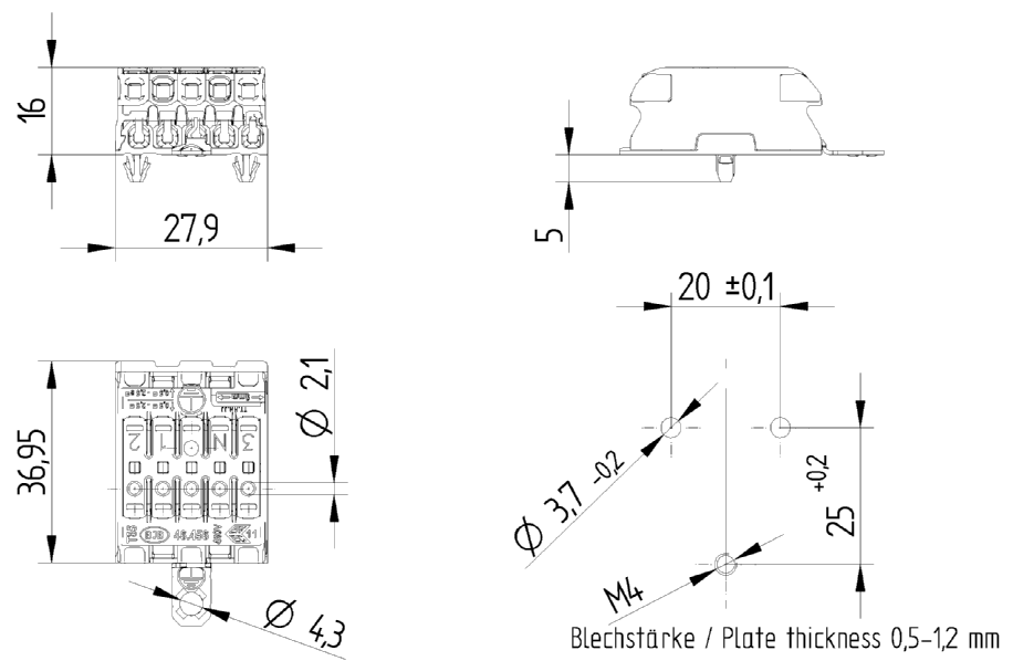 Neue Familie von RAST5-Verbindungsklemme mit 16 mm Höhe, eine perfekte Passform für alle Standard-EVGs Drahtlösefunktion auf beiden Seiten für den Anschluss von oben Einfache Bedienung durch Steckkontakt Anschluss von flexiblen Leitern oben möglich Mehrere Erdungsmöglichkeiten: Erdungsbügel, Schnellerdungskontakt (REK) und Erdungszeichen Verschiedene mechanische Befestigungsmethoden: Rastzapfen, Stift für Aluminiumprofile und Schraubbefestigung Verschiedene Standardmarkierungen verfügbar, weitere auf Anfrage