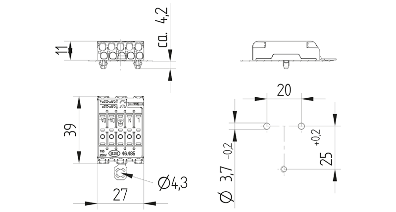 Flat Terminal block 5 poles with earth bracket, snap-in pins LNEZDA+DA- and contact opening function