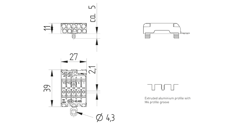 Flat Terminal block 5 poles with earth bracket, snap-in pins Aluprofile LNEZDA+DA- and contact opening function