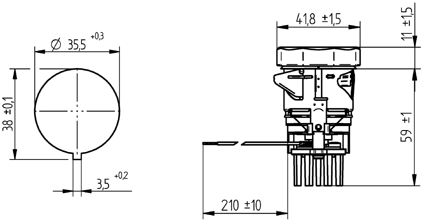 Push in fixing into standard cutouts ø 35.5 mm Material thickness: 0.6 - 2.5 mm