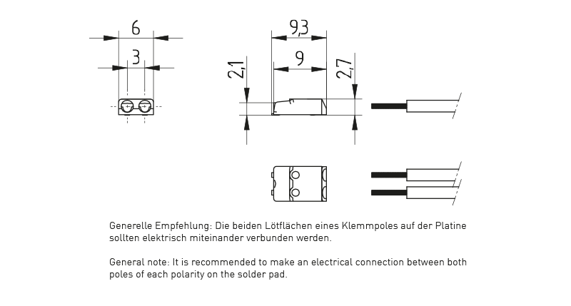 It is recommended to make an electrical connection between both poles of each polarity on the solder mask