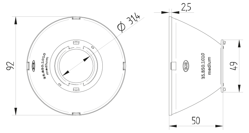 Reflector is optimized for use with connectors 47.319.2013 / 2021 / 2025 / 2026 / 2345 and 47.360.5010 with Ø 50 mm.