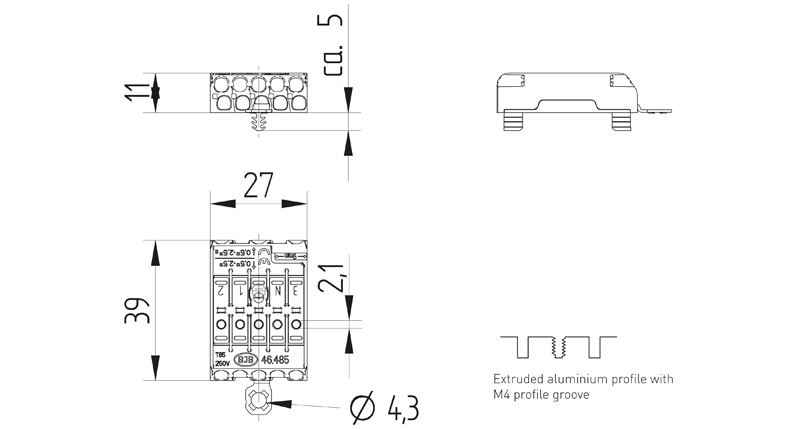 Flat Terminal block 5 poles with Earth bracket, snap-in pins Aluprofile 3NEZ12 and contact opening function