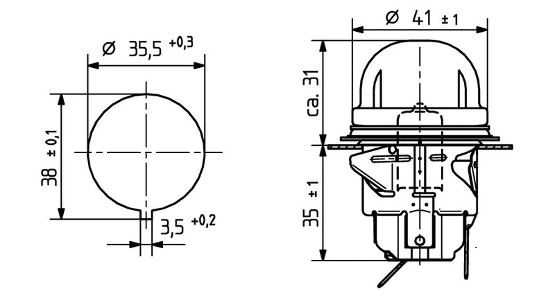 | Material: | Lens: soda-lime glass 350° CSleeve: CrNiLampholder: Steatite |