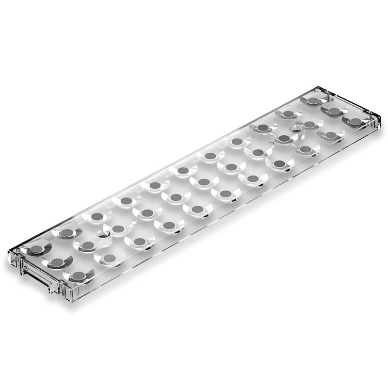 3D Spritzguß-Optik aus PMMA Extra breitstrahlend Optimiert für 5630 LED • Verbesserte Sichtverhältnisse und Kontrast der beleuchteten Bereiche • Gute und gleichmäßige Lichtverteilung