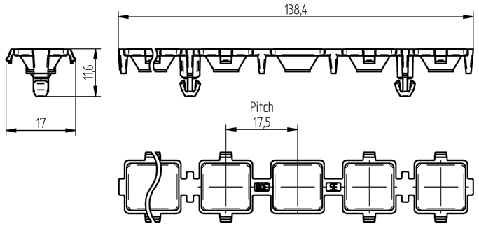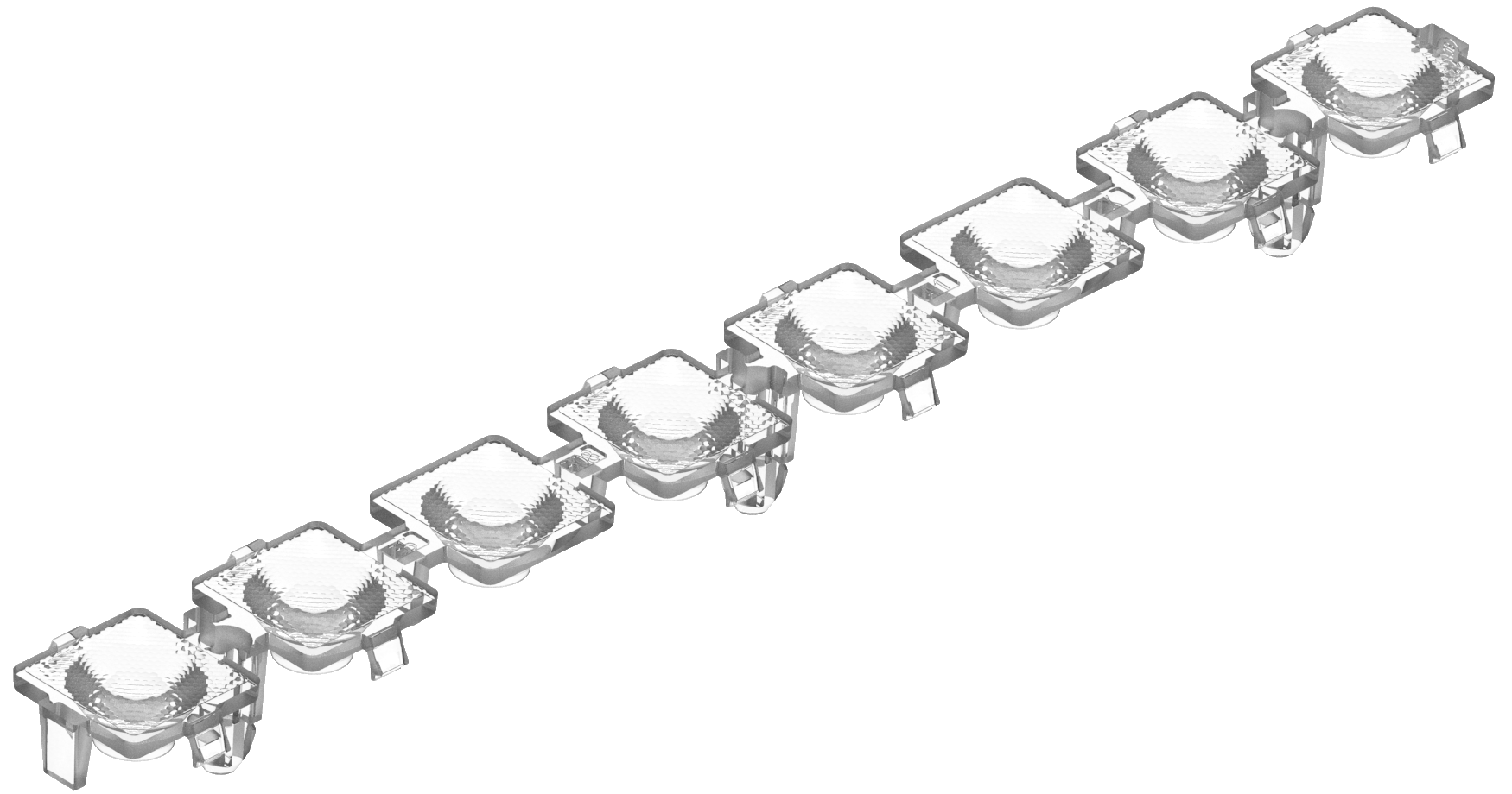 Pitchabhängige lineare Linsenanordnung - Narrow - Die Optik 35.308 (1/2 ft) ist für die Verwendung mit 35.316.A001 (Raster 1 ft) vorgesehen. - Optik und Raster sind nur separat erhältlich. Technische Daten - Zentrierung und Fixierung der Leiterplatte durch Optiken mit Rastzapfen. - Der Abstand zur Leiterplatte wird durch die Abstandshalter an der Optik gewährleistet.