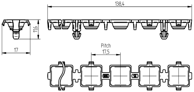 Pitchabhängige lineare Linsenanordnung - Wide - Die Optik 35.308 (1/2 ft) ist für die Verwendung mit 35.316.A001 (Raster 1 ft) vorgesehen. - Optik und Raster sind nur separat erhältlich. Technische Daten - Zentrierung und Fixierung der Leiterplatte durch Optiken mit Rastzapfen. - Der Abstand zur Leiterplatte wird durch die Abstandshalter an der Optik gewährleistet.